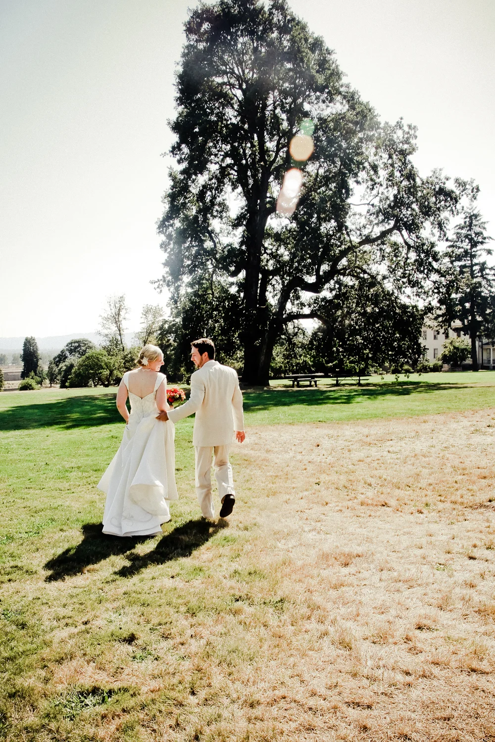 A bride and groom walking hand in hand outdoors on their wedding day, smiling and holding hands with sunlight shining behind them.
